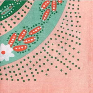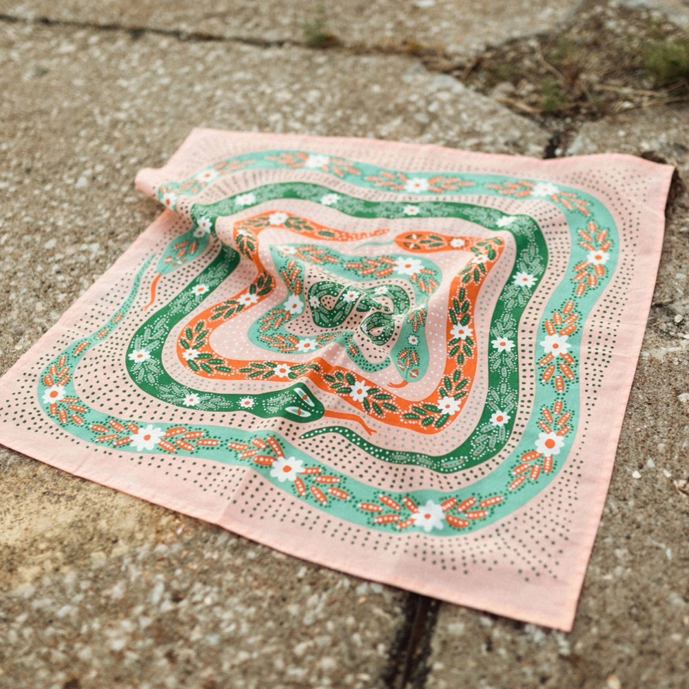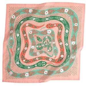 This bandana is a striking visual feast that marries folk art charm with a hint of wild mystique. Designed on a soft peach base, it features a mesmerizing spiral of serpents, each one adorned with floral patterns in lively shades of green, coral, and mint. The snakes, symbolizing transformation and power in many cultures, coil inward in hypnotic symmetry, drawing the eye toward the intricately entangled center.