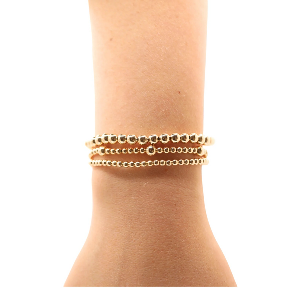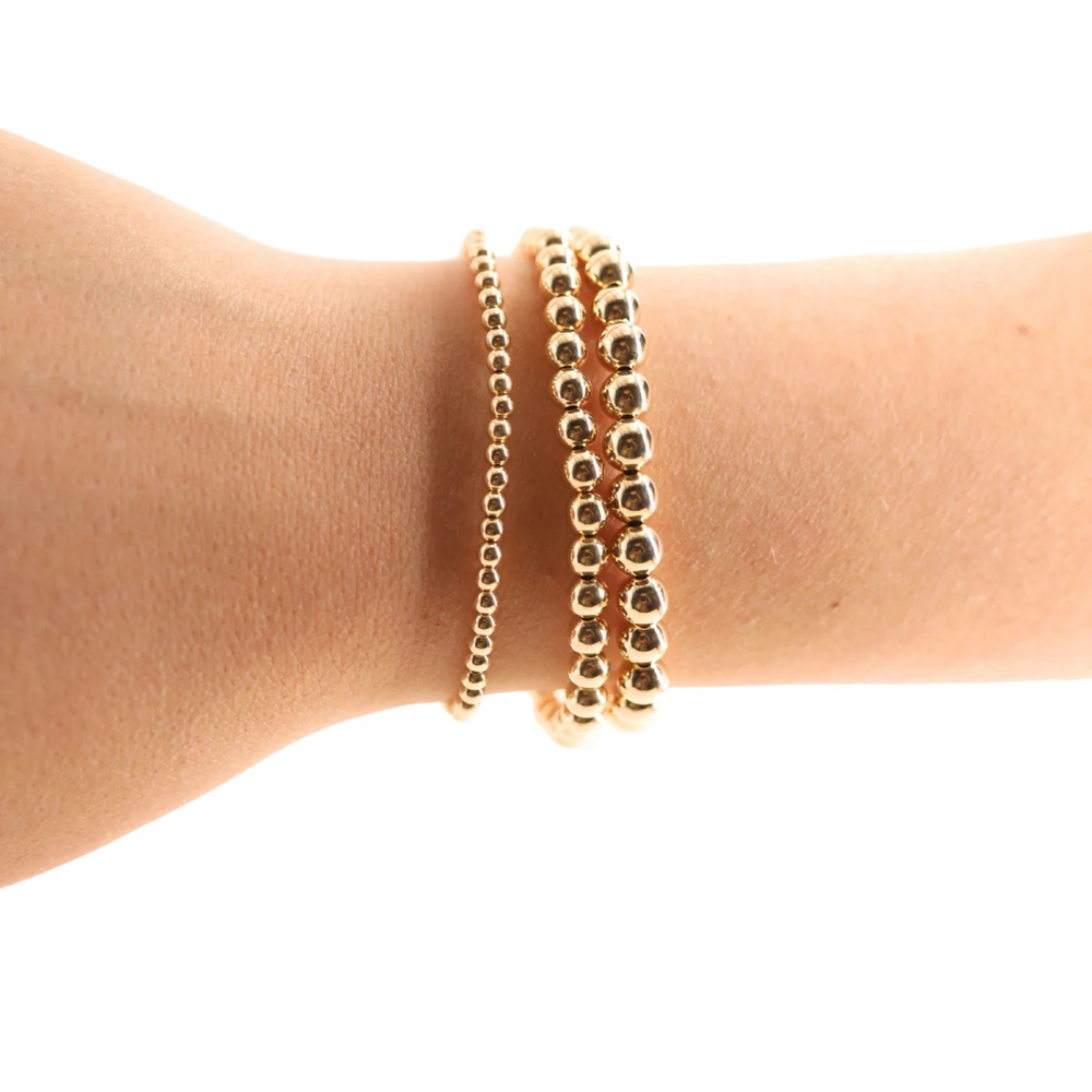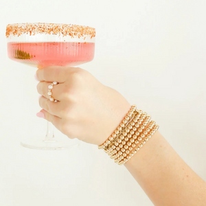 Embrace timeless elegance with this stackable beaded bracelet adorned with stunning 5MM gold beads. Handcrafted in College Station, Texas using 14 K gold filled and elastic string, this piece exudes luxury and sophistication. Not only is it a beautiful addition to any outfit, but it is also waterproof, workout proof, and tarnish proof, ensuring it stays pristine for years to come.