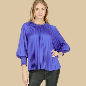 What a sight as you step out in fabulous fall fashion with this regal color luxe top! It is an unlined pleated material with a satiny feel, and it features a round neckline with back keyhole closure. The long lloose sleeves with a ruffled smocked cuff. The top offers a relaxed silhouette and makes the perfect top for work or play.