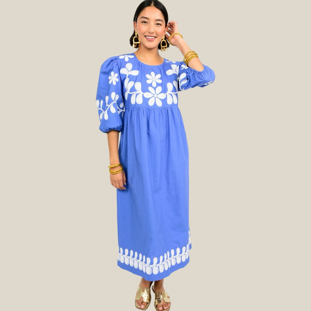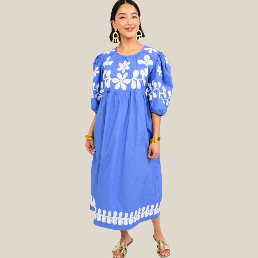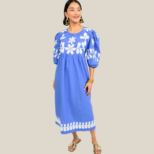 Step into effortless beauty with our Blue Cord Embroidered Midi Dress. Featuring exquisite white floral embroidery across the bodice, sleeves, and hem, this soft periwinkle blue dress brings a fresh and artistic touch to your wardrobe. Designed with billowy three-quarter puff sleeves and a relaxed midi silhouette, it’s the perfect combination of comfort and style. Ideal for brunch dates, garden parties, or weekend getaways, this dress will have you floating through your day in style.