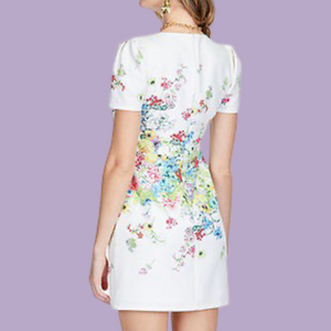 This elegant white floral dress is a must-have! It is perfect for those who appreciate a blend of sophistication and femininity. Featuring a flattering V-neckline and short puff sleeves, it offers a chic yet timeless silhouette. The delicate floral print, cascading beautifully across the fabric, adds a touch of romance and freshness, making it ideal for spring and summer occasions. Whether for brunch, a garden party, or a casual day out, this dress embodies effortless grace and style.