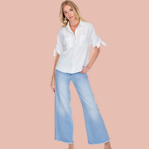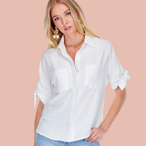 Enhance your everyday style with this effortlessly chic white button-down shirt! Designed in a soft, lightweight fabric, this top features a relaxed fit with front pockets and stylish tie-detail sleeves for a modern twist. Perfect for layering or wearing solo, this versatile piece pairs beautifully with denim, trousers, or shorts for a polished yet casual look. Whether you're heading to brunch or running errands, this timeless staple is a must-have for any wardrobe!
